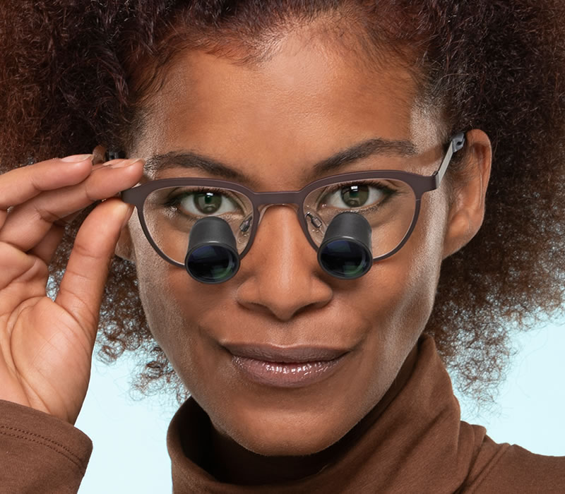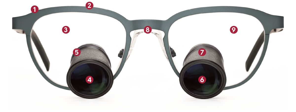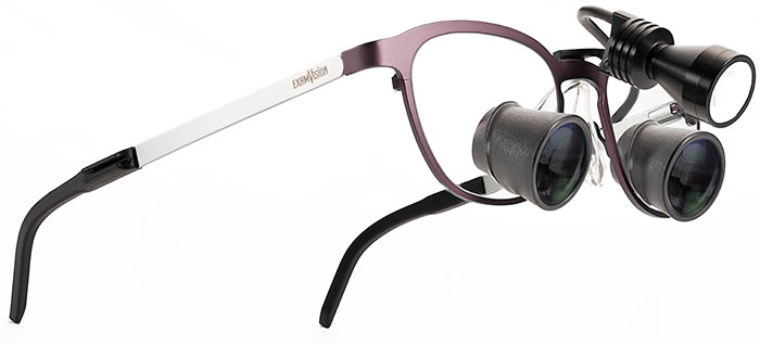 ExamVision offers only custom danish-designed stylish frames that are made specifically to accommodate loupes. The perfectly balanced frames with contour adjustable arms reduce weight transfer to the nose, eliminate the need for headband support, and facilitate extended wear.