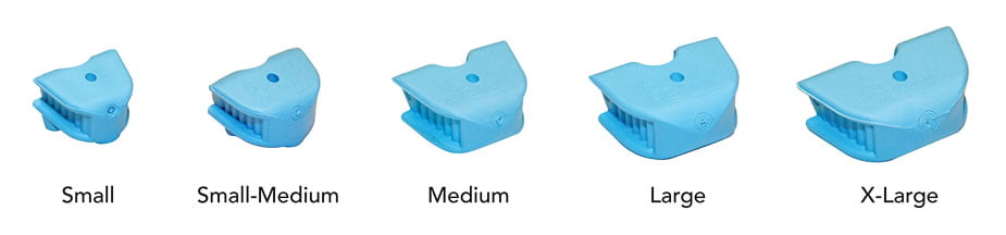 The bite blocks come in 5 different sizes: Small, Small-Medium, Medium, Large and X-Large. The Small size bite block is great for children under 12 years of age. The Small-Medium bite block is ideal for small framed patients, especially females and teenagers. Medium, Large and X-Large bite blocks are fitted mostly for males. The way you gauge the bite blocks is to size the block to roughly 2/3 to 3/4 of a full mouth opening. One of the benefits of the EZ DAM® system is that the bite blocks are interchangeable quickly so you can easily size up the patients. You can sterilize the ones you’ve tried in, in order to be ready for the next patient.