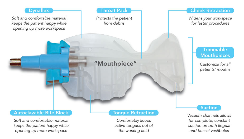 The “Soft” mouthpiece is made of a unique latex-free material called Dynaflex, which is very flexible and trimmable. The soft mouthpiece comes in both “Adult” and “Junior” sizes and is recommended for all patients. The flexibility of the mouthpiece allows the practitioner to move freely by displacing the mouthpiece as they work around the oral cavity.