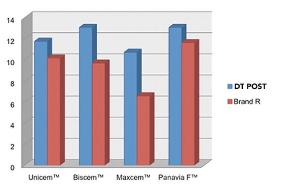 In a comparative study, DT POST® exhibited between 15% and 63% higher microtensile bond strength, depending on the brand of self-adhesive resin cement that was used.