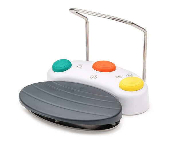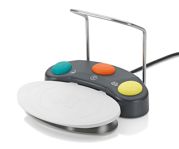 Implantmed pumpThe new pump design makes insertion of the coolant hose secure and quick. | Regular foot controlThe multifunctional foot control allows sterile working and optimum freedom for your hands. | Wireless foot controlWith the wireless foot control you can select the optimum position in the work area without restrictions or cables. Available as an option or upgrade. |