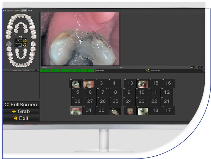 Easily capture and save images by tooth number in a mount CADI-integrated intra-oral camera, allows the user storage capability without interaction with the computer. Simply press the “move frame button” and captured images will be saved to the correct tooth number. This unique feature saves a tremendous amount of time, improves workflows and encourages ongoing use of the camera for every patient.