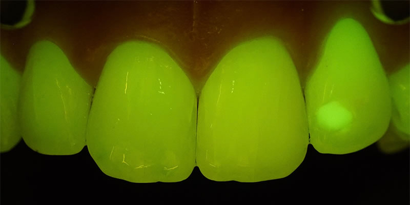 In addition to the white LED, the Flexion Twin Blue is equipped with a second LED (dark blue). This second beam projects fluorescent UV light, which improves the identification of restoration materials, tartar and caries. It also causes porphyrins inside the caries bacteria to fluorescence orange/red.