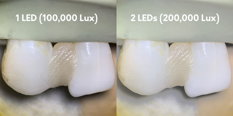 The Flexion Twin White is equipped with an additional powerful white light for additional luminosity. Both LEDs can be switched independently to offer 200,000 Lux of total luminosity. This is ideal for identifying structure in the root canal.