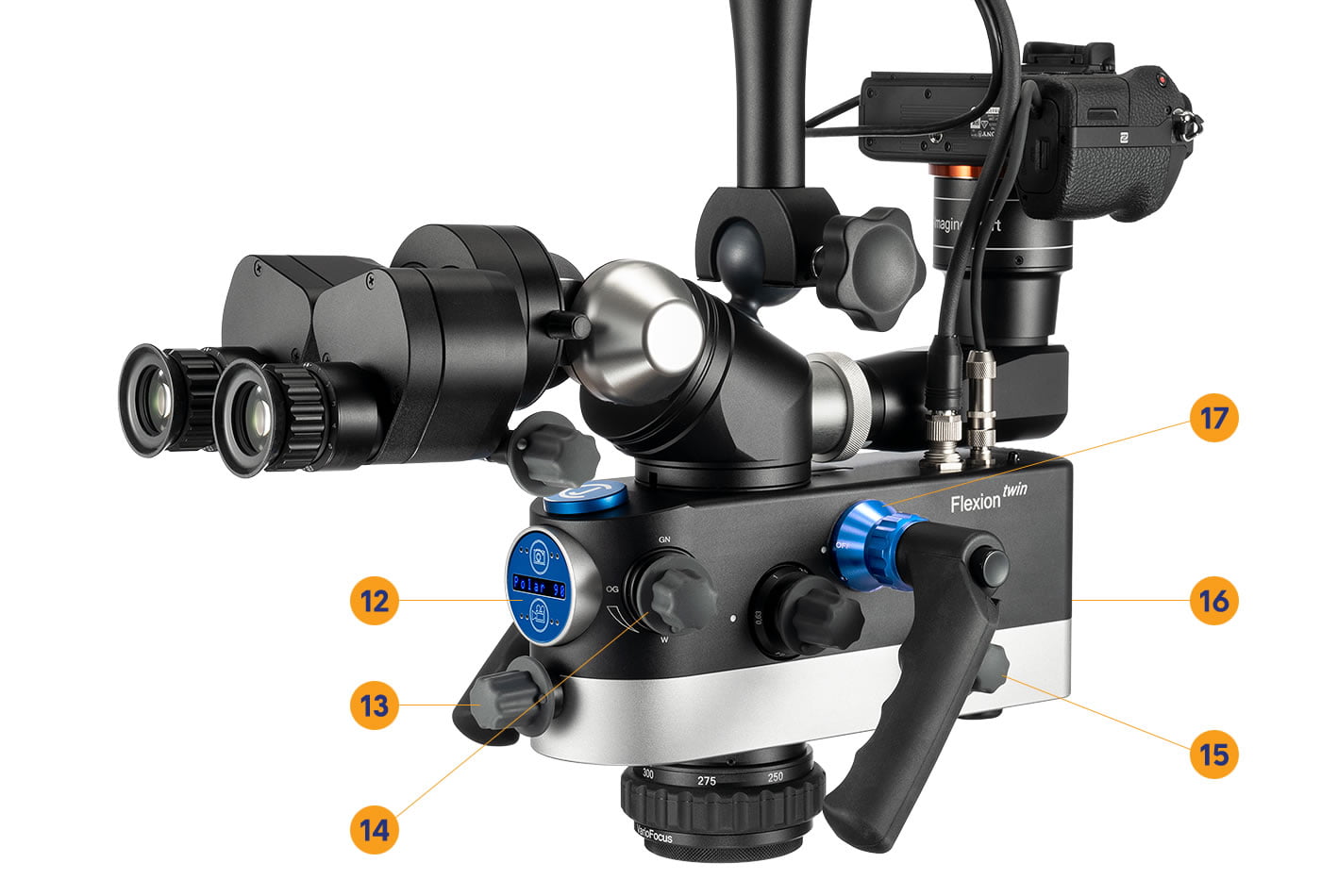 15. Rear Iris DiaphragmControls the aperture (width) of the rear lighting | 16. AntiGlare ModeEliminates unwanted reflections on the tooth (located on the left) | 17. Twin ModeFluorescence Mode (Twin Blue) or Boost Mode (Twin White) |