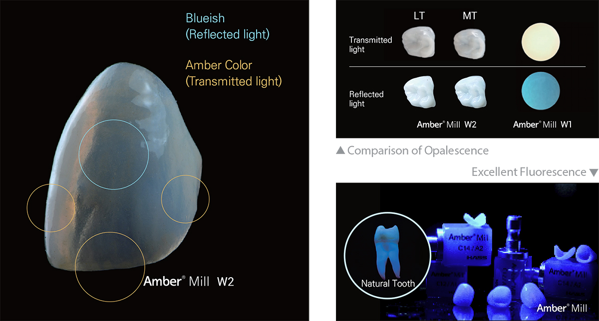 Amber® Mill offre une translucidité et une fluorescence exceptionnelles, permettant aux restaurations d’obtenir un dégradé de teinte naturel — de la zone cervicale jusqu’à la face incisale ou occlusale — simplement par glaçage, sans nécessiter de coloration supplémentaire. Cela constitue un avantage esthétique majeur.