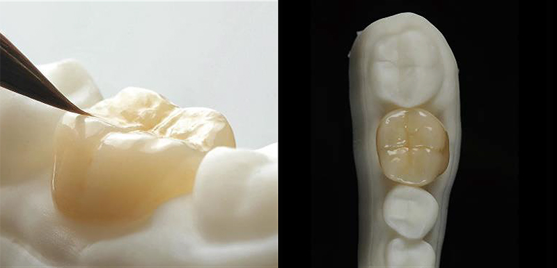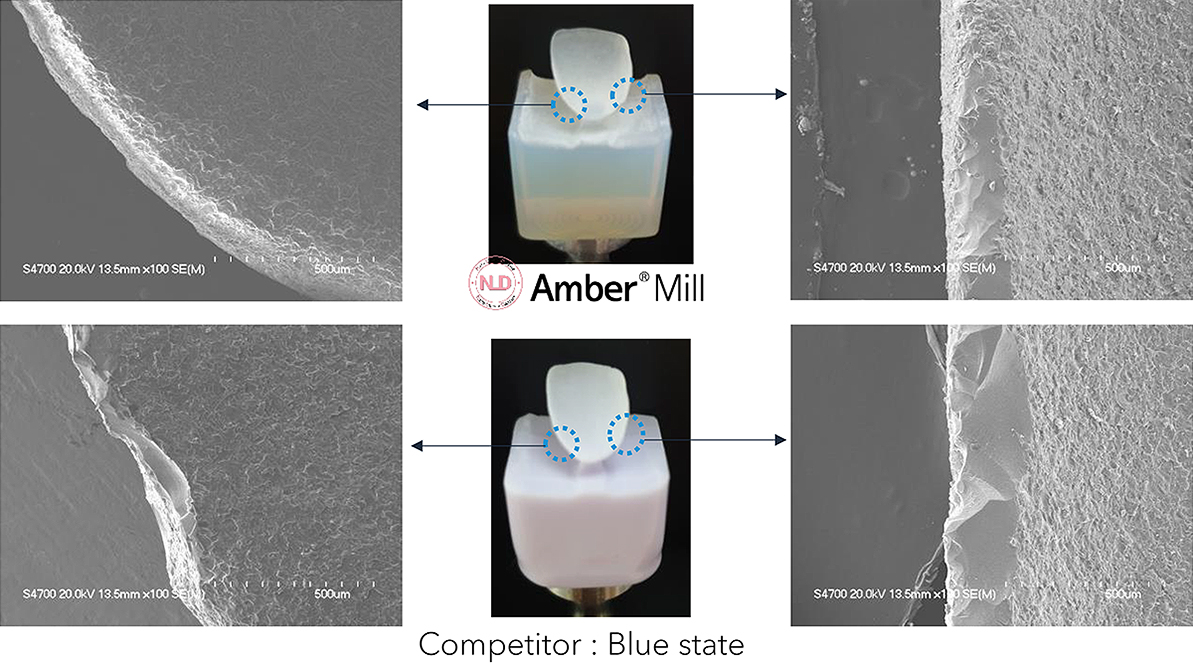 L’excellente usinabilité d’Amber® Mill se vérifie clairement en examinant les bords des restaurations usinées. La grande stabilité des bords et la faible occurrence d’éclats démontrent qu’Amber® Mill est un bloc de disilicate de lithium usinable optimisé pour les systèmes CAD/CAM.
