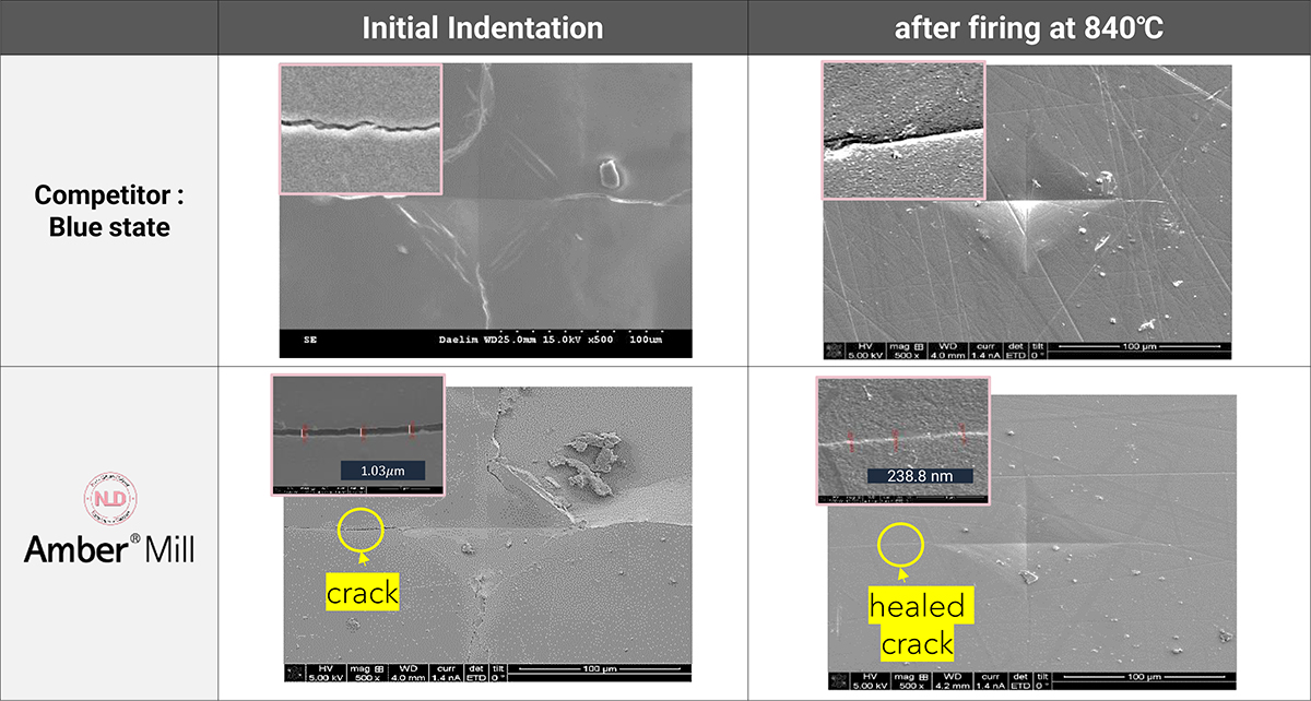 La structure cristalline plus dense et davantage réticulée d’Amber® Mill confère des propriétés physiques supérieures. La résistance à la flexion biaxiale d’Amber® Mill atteint 450 MPa après cristallisation complète.