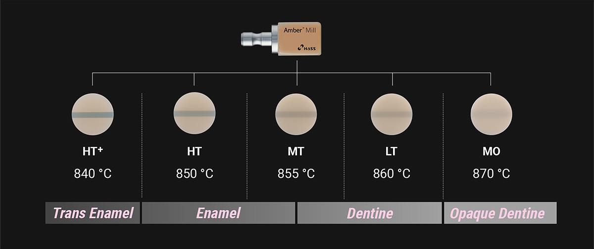 Avec un seul bloc Amber® Mill, vous pouvez réaliser des restaurations présentant une large gamme de niveaux de translucidité. Il suffit de choisir la teinte souhaitée et d’appliquer le traitement thermique de translucidité à la température appropriée. Cette flexibilité améliore considérablement l’efficacité du flux de travail et simplifie la gestion des stocks de blocs CAD/CAM.