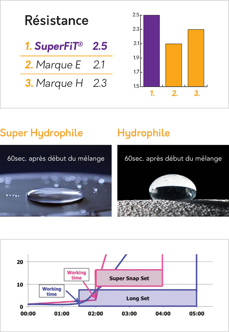 SuperFiT!® Light (Rose) produit un niveau de détails extraordinaire, comparable aux meilleurs matériaux offerts sur le marché. Sous pression, il s’infiltre parfaitement dans les sulcus sans provoquer de bavures. Son temps de travail est aussi optimisé pour des impressions multiples, et son temps de prise est réduit.